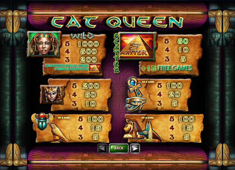cat-queen-infoNesten absolutt alle de ulike symbolene i Cat Queen dukker faktisk opp stablet, og derfor kan de dekke absolutt hele settet med hjul med nøyaktig det samme symbolet. De to eneste symbolene som har litt kreativitet bak seg, og som skiller seg ut, er pyramiden og Cat Queen-symbolet. Pyramiden er faktisk spillets scattersymbol, mens Cat Queen er den som representerer wildsymbolet i spillet. Når Cat Queen-wildsymbolet har blitt stablet vil en animasjon dukke opp, da vil skjermen sakte gå over til de grønne øynene som helt tydelig tilhører en svart katt. Wildsymbolet i spillet fungerer på akkurat samme måte som vanlig, ved at den erstatter alle de andre symbolene i spillet, med unntak av scattersymbolet. Dersom fem wildsymboler blir stablet på en rad vil utbetalingen bli på 1 000 mynter for hver mynt som har blitt satset. Siden det ikke finnes noen multiplikatorer eller bonuser i spillet, vil den aller største gevinsten i spillet komme dersom fem scattere blir utbetalt. Dersom spillerne får til dette, vil de vinne 2 000 mynter for hver mynt de har satset. I tillegg til dette vil spillerne motta hele 15 gratisspinn. Mens denne bonusrunden er aktivert, vil skjermen bli blå, noe som signaliserer hvilken modus man befinner seg i.